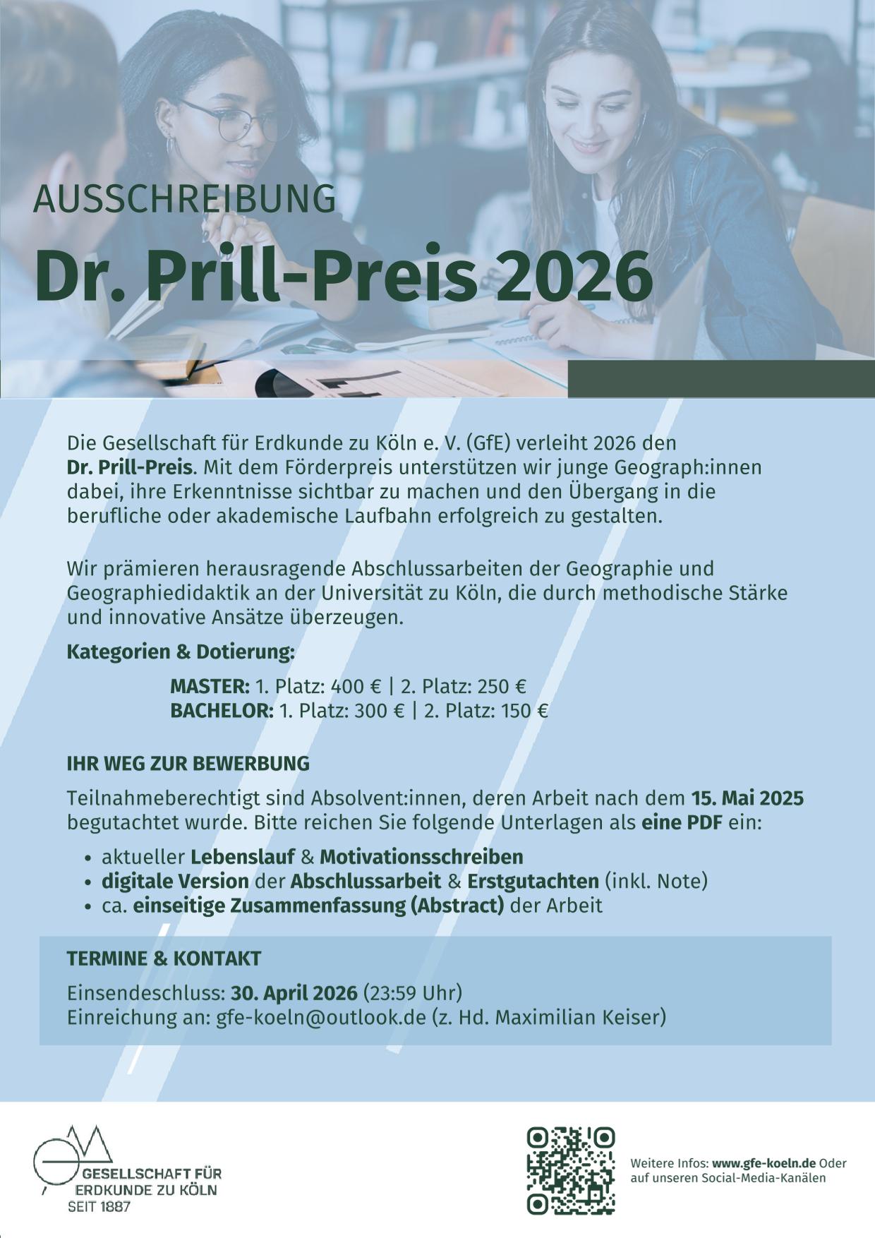 Die Gesellschaft für Erdkunde zu Köln e. V. (GfE) verleiht 2026 den Dr. Prill-Preis. Mit dieser Auszeichnung würdigen wir herausragende Abschlussarbeiten der geographischen Studiengänge an der Universität zu Köln.